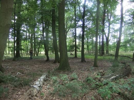 Naturnahe Auenwälder, wie man sie an einem Fluss erwarten würde, sind im Gebiet der Mulde nur kleinflächig als Restbestände vertreten. Die drei größten Bestände waren ein Kiefernwald östlich von Glaucha, eine Fläche bestehend aus Fichtenforst und Eichen-Mischwäldern im Zentrum des Projektgebiets gegenüber von Laußig und ein Eichenhain im Süden des Projektgebiets gegenüber von Gruna. Aber auch an diesen Beständen sowie einzelnen Baumgruppen in der offenen Landschaft, kann man bei genauerer Analyse Anhaltspunkte für die Zusammensetzung der ehemaligen Hartholzauenwälder und ihrer Nutzung finden. Betrachtet man die vorhandenen Reste des Eichenwaldes und die einzelnen Eichen, die im Offenland stehen sowie die Vegetation in kleineren Senken und Mulden, die durch die frühere Flussdynamik entstanden sind, ist es vorstellbar, dass Eichen-Ulmenauenwälder früher stärker im Projektgebiet verbreitet waren (Abbildung 1). An einzelnen alten Eichen mit ihrem teilweise freigelegten Wurzelwerk kann man Spuren der ehemaligen Eichelmast feststellen, die in den damaligen Eichenwäldern durchgeführt wurde. Vereinzelt konnte Eichenverjüngung im Projektgebiet beobachtet werden (Abbildung 3). An etwas höher liegenden Stellen der Aue, sind auch Eichen-Buchen-Hainbuchenwälder zu finden, die einen wichtigen Teil im Biotopverbund von Waldflächen darstellen und einen Übergang zu den Waldbereichen in der Aue bilden (Abbildung 2).