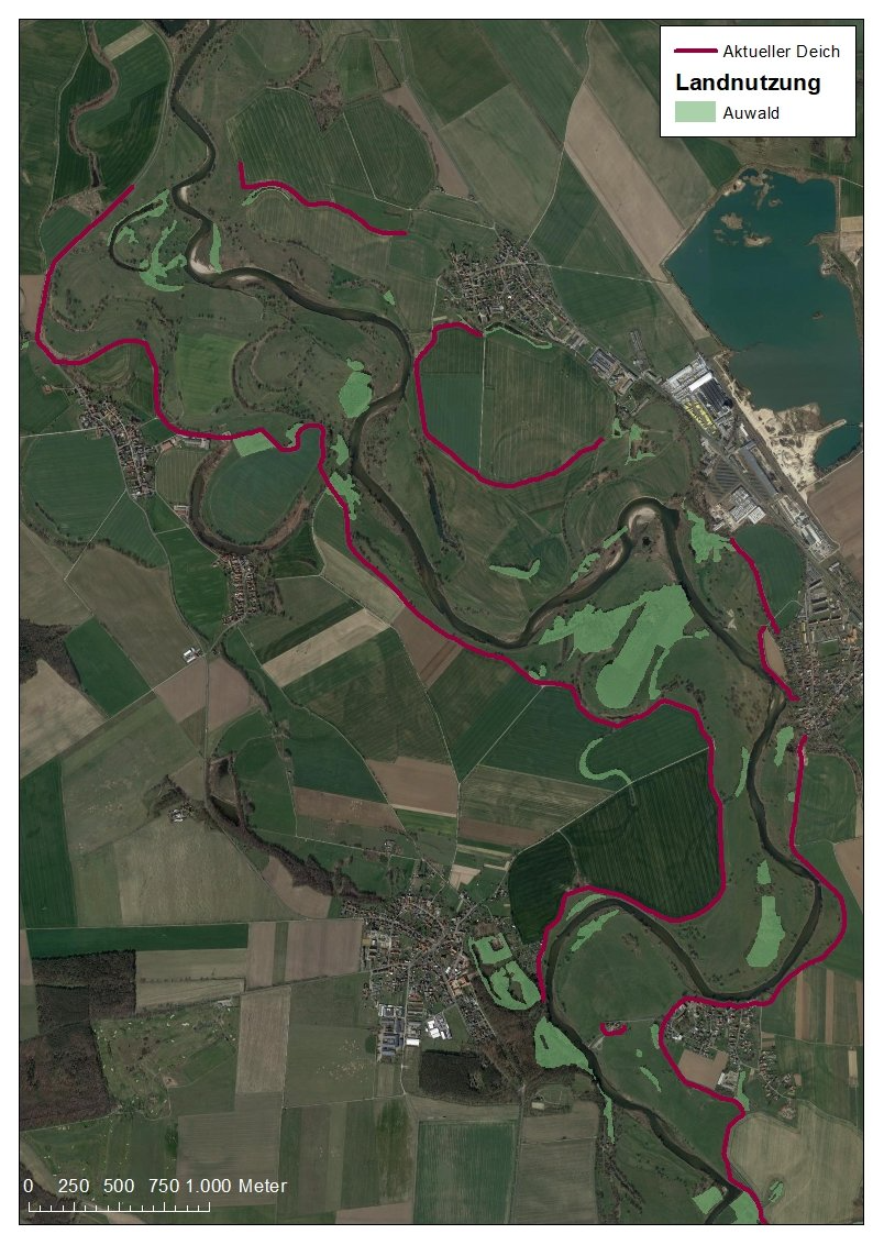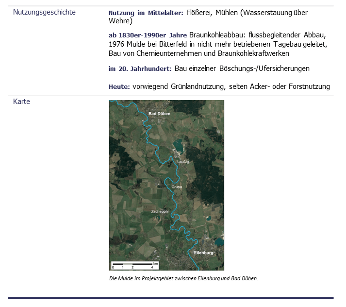 Flussab des Projektgebiets in Sachsen-Anhalt im Landkreis Anhalt-Bitterfeld zwischen der Mündung bei Dessau-Roßlau flussaufwärts bis Retzau wurde kürzlich das Projekt „Wilde Mulde - Revitalisierung einer Wildflusslandschaft in Mitteldeutschland“ abgeschlossen. Das Projekt wurde vom WWF Deutschland (Verbundkoordination, Umsetzungspartner), Helmholtz Zentrum für Umweltforschung (UFZ) (Forschungspartner), Technische Universität 13 Braunschweig (Forschungspartner), Hochschule für Technik und Wirtschaft Dresden (Forschungspartner), Universität Leipzig (Forschungspartner), Leibniz-Universität Hannover (Forschungspartner) im Zeitraum vom Dezember 2015 bis November 2020 umgesetzt (Forschung zur Umsetzung der nationalen BiodiversitätsStrategie o.J.). Das Untersuchungsgebiet wurde ausgewählt, da es in diesem Flussabschnitt teilweise noch unverbaute Ufer gibt, welche dynamische Prozesse und einen Austausch mit den naturnahen Auenbereichen ermöglichen (WWF 2016). Für die Revitalisierung des Flusses sollten Naturufer wiederhergestellt und Seitenarme wieder angebunden sowie eine initiale Entwicklung von Hartholzwäldern ermöglicht werden. Die Wiederanbindung des Flusses an die angrenzende Aue wurde damit gefördert (Helmholz Zentrum für Umweltforschung 2018). Die Arbeit vor Ort wurde von verschiedenen Forschungsarbeiten zu den Auswirkungen der Maßnahmen auf die Arten, Biodiversität und deren Wechselbeziehungen begleitet. Dafür wurde der Flussabschnitt in fünf Untersuchungsgebiete unterteilt, in denen die einzelnen Maßnahmen umgesetzt werden konnten.