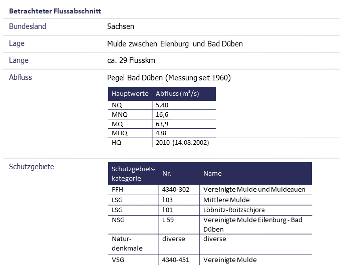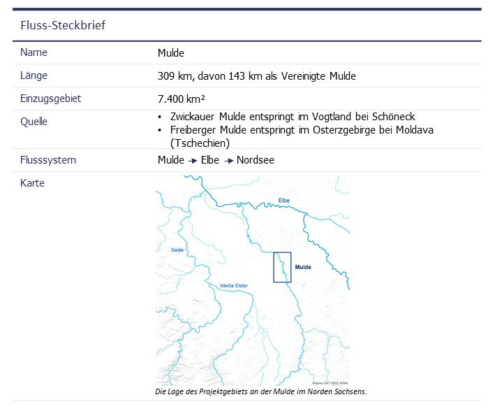 Flussab des Projektgebiets in Sachsen-Anhalt im Landkreis Anhalt-Bitterfeld zwischen der Mündung bei Dessau-Roßlau flussaufwärts bis Retzau wurde kürzlich das Projekt „Wilde Mulde - Revitalisierung einer Wildflusslandschaft in Mitteldeutschland“ abgeschlossen. Das Projekt wurde vom WWF Deutschland (Verbundkoordination, Umsetzungspartner), Helmholtz Zentrum für Umweltforschung (UFZ) (Forschungspartner), Technische Universität 13 Braunschweig (Forschungspartner), Hochschule für Technik und Wirtschaft Dresden (Forschungspartner), Universität Leipzig (Forschungspartner), Leibniz-Universität Hannover (Forschungspartner) im Zeitraum vom Dezember 2015 bis November 2020 umgesetzt (Forschung zur Umsetzung der nationalen BiodiversitätsStrategie o.J.). Das Untersuchungsgebiet wurde ausgewählt, da es in diesem Flussabschnitt teilweise noch unverbaute Ufer gibt, welche dynamische Prozesse und einen Austausch mit den naturnahen Auenbereichen ermöglichen (WWF 2016). Für die Revitalisierung des Flusses sollten Naturufer wiederhergestellt und Seitenarme wieder angebunden sowie eine initiale Entwicklung von Hartholzwäldern ermöglicht werden. Die Wiederanbindung des Flusses an die angrenzende Aue wurde damit gefördert (Helmholz Zentrum für Umweltforschung 2018). Die Arbeit vor Ort wurde von verschiedenen Forschungsarbeiten zu den Auswirkungen der Maßnahmen auf die Arten, Biodiversität und deren Wechselbeziehungen begleitet. Dafür wurde der Flussabschnitt in fünf Untersuchungsgebiete unterteilt, in denen die einzelnen Maßnahmen umgesetzt werden konnten.
