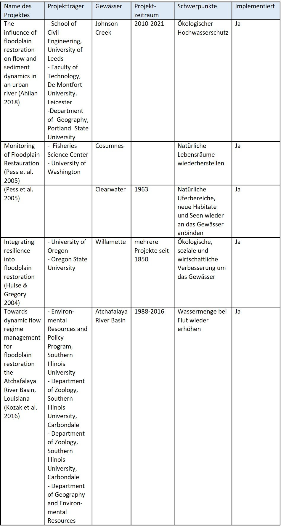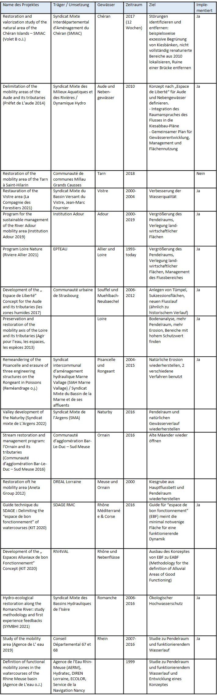 Es gab allerdings auch Projekte mit dem naturschutzfachlichen Ziel, also die natürliche Dynamik und Prozesse zu fördern und dadurch neue Lebensräume zu schaffen bzw. zu erhalten. Die Projekte „Program for the sustainable management of the River Adour mobility area” und “Program Loire Nature” können hier exemplarisch genannt werden. Diese beiden Projekte haben es sich zur Aufgabe gemacht, die angrenzenden Flächen der Loire und Adour zu pachten bzw. kaufen und dadurch die angrenzenden Flussbereiche wieder dem Gewässer zur Verfügung zu stellen (Riviere Allier 2021, Institution Adour 2019). Weitere Projekte zum Pendelraum der Gewässer in Frankreich sind in der nachfolgenden Tabelle dargestellt.